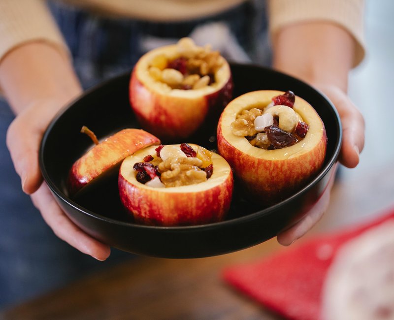• The apples should be firm and juicy to hold their shape while baking. Slice off the tops, then use a knife or spoon to remove the core and seeds (cored apple weighs ~200 g), creating space for the filling. Spoon 55 g of filling into each apple and place them in a baking dish.